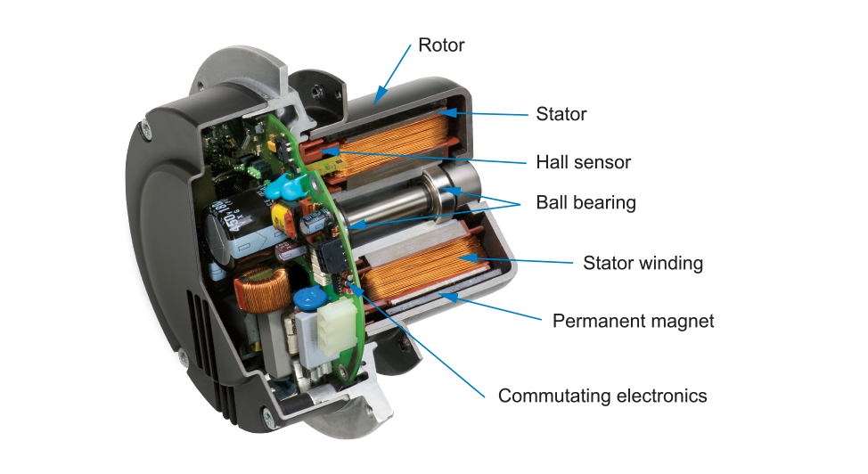 EC motor is an electric motor driven by electronically commutated direct current controller that has no friction or wear parts such as commutator and brushes found in standard direct current motors. This function is performed by maintenance-free EC-controller PCB. New electric motors are featured with high efficiency and the total controllable speed range. EC motor electronic controller enables extra functions as speed control depending on temperature, pressure or other parameters.