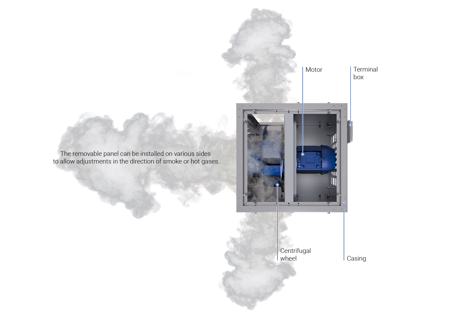The sound-insulated dual-purpose smoke extraction fan is used in emergency exhaust ventilation systems for forced extraction of smoke, heated gases and combustion products.